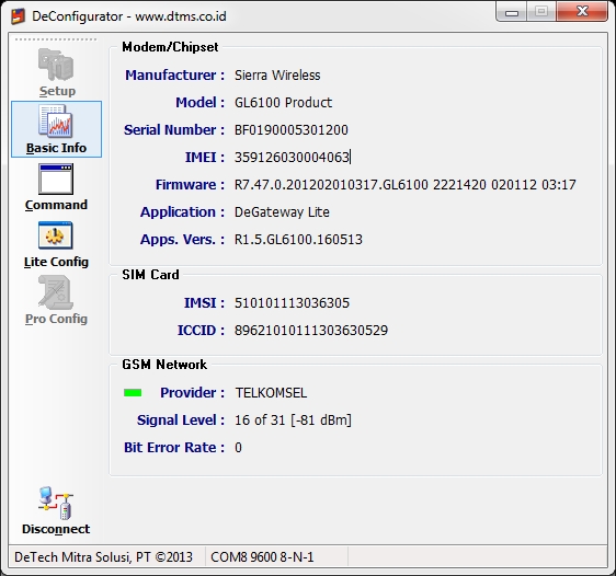 Aplikasi ini melakukan komunikasi dengan modem secara serial via COM port pada komputer. Untuk kebutuhan pemasangan di lapangan maka aplikasi ini dilengkapi dengan fasilitas monitor sinyal dan status registrasi ke jaringan GSM.
